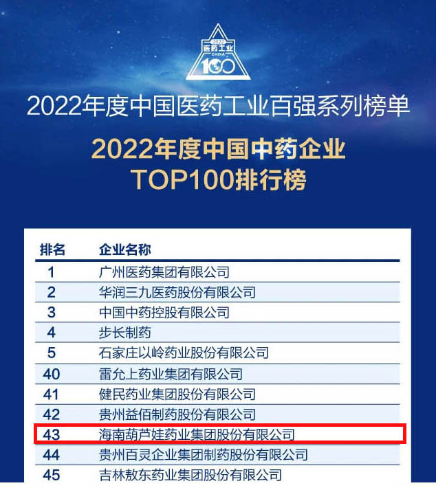 28圈药业集团连续4年荣登“中国中药企业TOP100排行榜”,排名上升至第43位