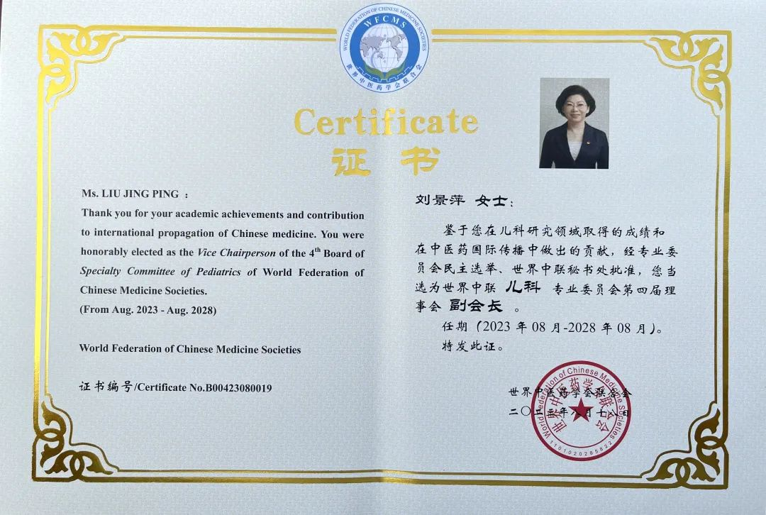 28圈药业集团党委书记、董事长刘景萍当选世界中医药学会联合会儿科专业委员会第四届理事会副会长